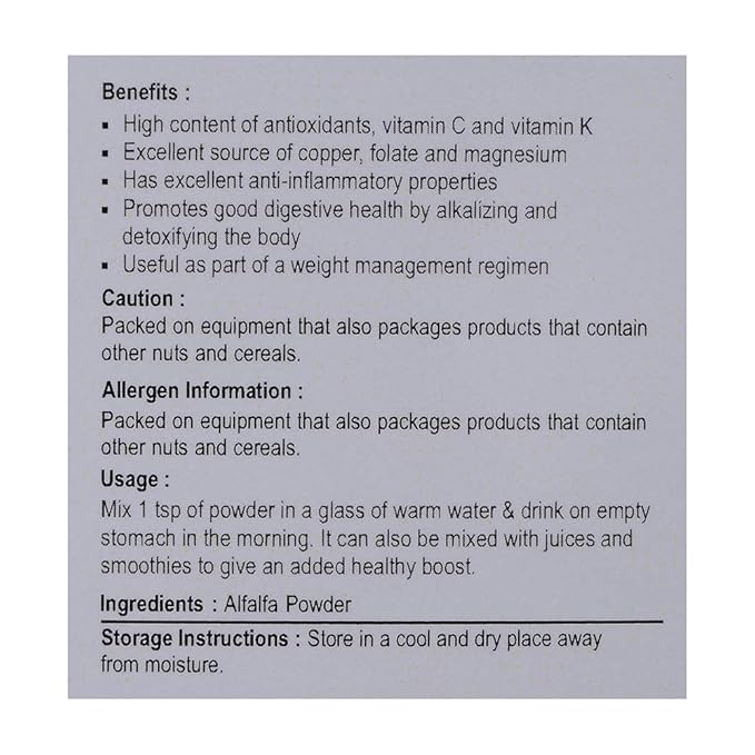 I've been a regular consumer of health supplements, and Nutriwish Alfalfa Powder has exceeded my expectations. The powder is finely ground, has a vibrant green color, and a pleasant earthy taste that works well in my morning smoothies. It's a fantastic source of vitamins and minerals. The packaging is also very good, keeping the powder fresh for a long time. Definitely a pantry staple for anyone on a healthy lifestyle journey.