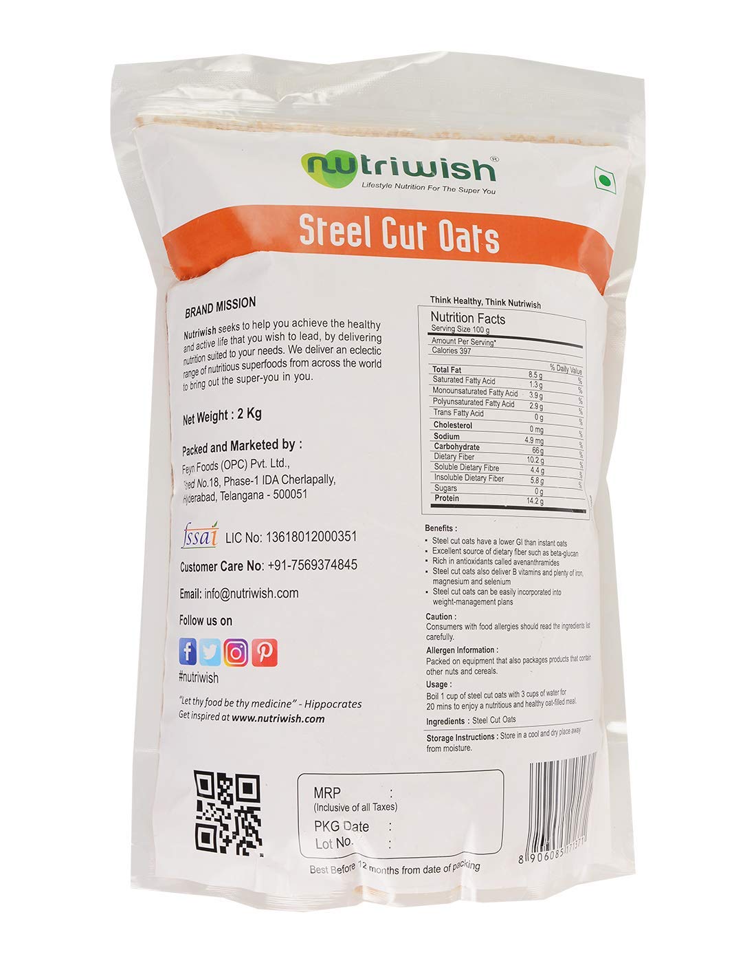 As a nutritionist, I recommend steel cut oats to my clients as an excellent source of dietary fiber. This Nutriwish brand is pure and reliable.